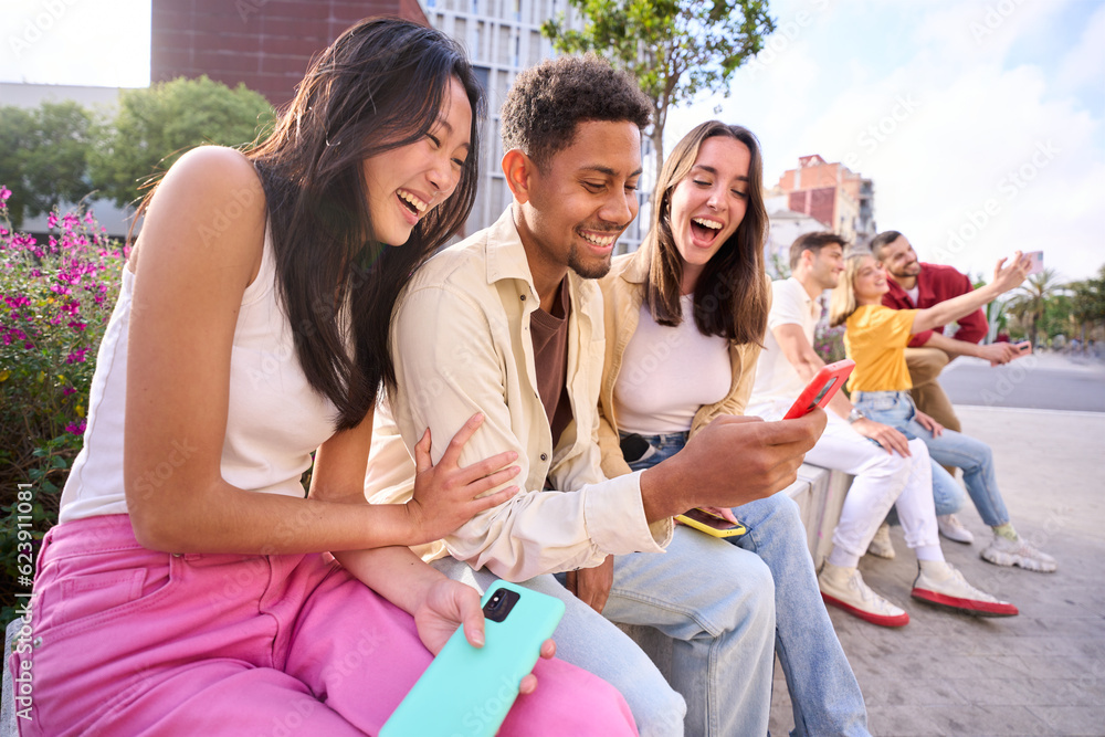 Multiracial happy group of friends using phone and smiling together outdoor. People addicted to technology and social media. Fun young and networks as means of communication.