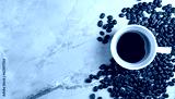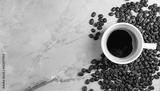 Cup of black coffee with coffee beans on marble table. Copy space. Top view.