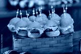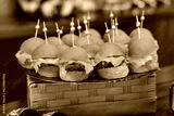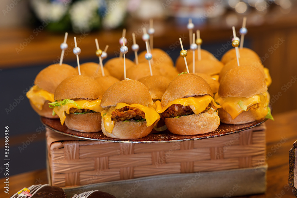 mini hamburgers with toothpicks, finger food, kids birthday party, retro deco in the background