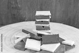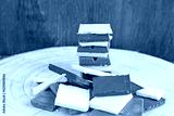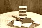 Horizontal shot of organic chocolate squares forming a pile and a heap over wooden background.