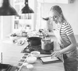 Young woman using a tablet computer to cook in her kitchen