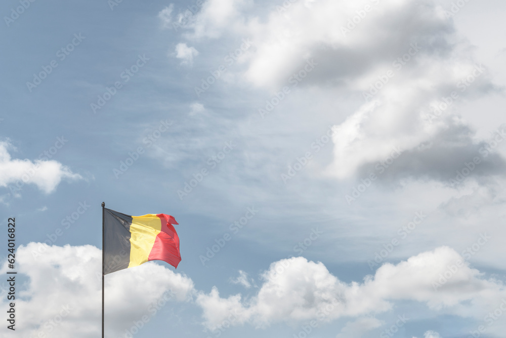 Belgian National Day. The national flag of the Kingdom of Belgium against the background of clouds in the sky. copy space