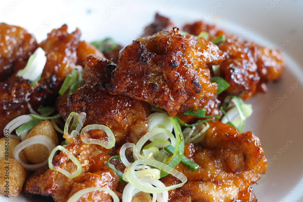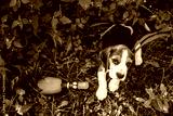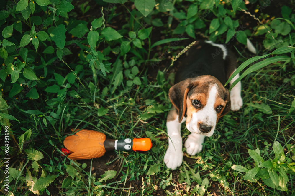 Portrait of beagle puppy in green grass in park. Cute lovely pet