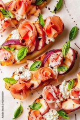 Top view of open sandwiches with griddled peach, parma ham or prosciuto, bread, and robiola cheese, with balsamic vinegar and basil. Food background. Top view, close-up.