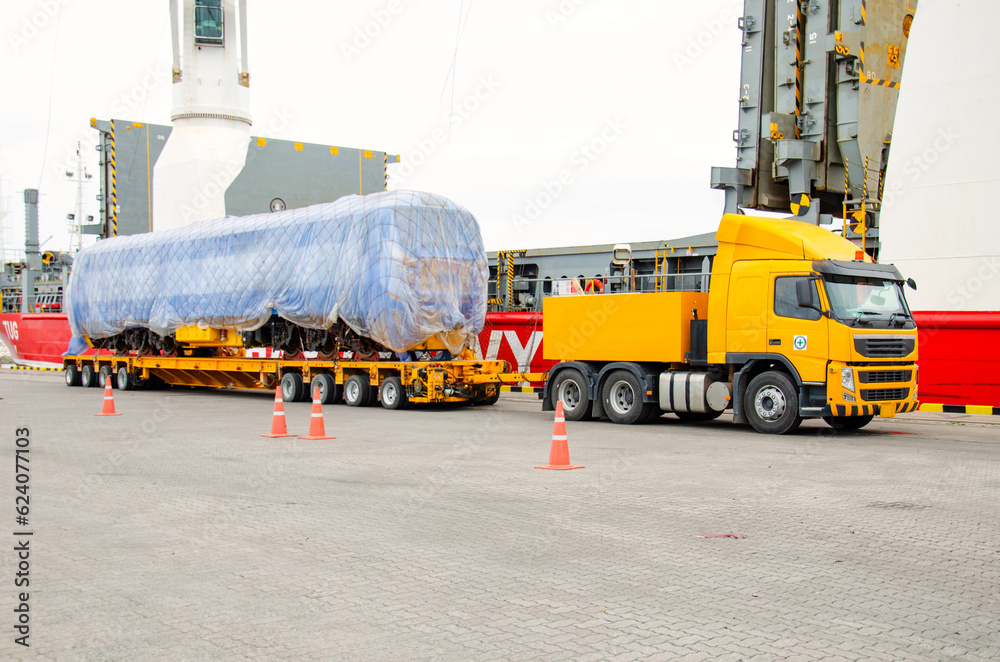 Transport of Oversize Heavy Machinery cargo truck Loading a new locomotive port area