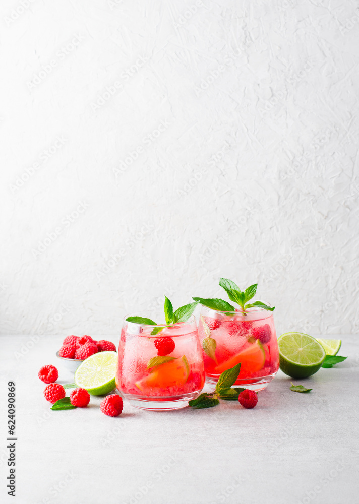 Refreshing Cold Cocktail or Mocktail with Berries and Lime, Raspberry Lemonade