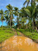 Flooded and impassable road between coconut palms after heavy tropical rainfall
