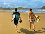 CLOSE UP: Back view of a walking young surf couple with surfboards going surfing