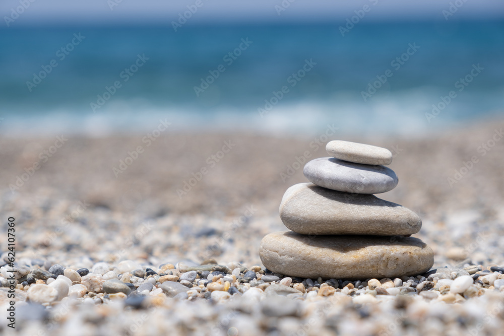 Round stones lie on top of each other in a column on the seashore on a sunny summer day. The concept of order and tranquility