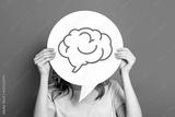 Mental health concept. The girl holds a poster with the image of the human brain.