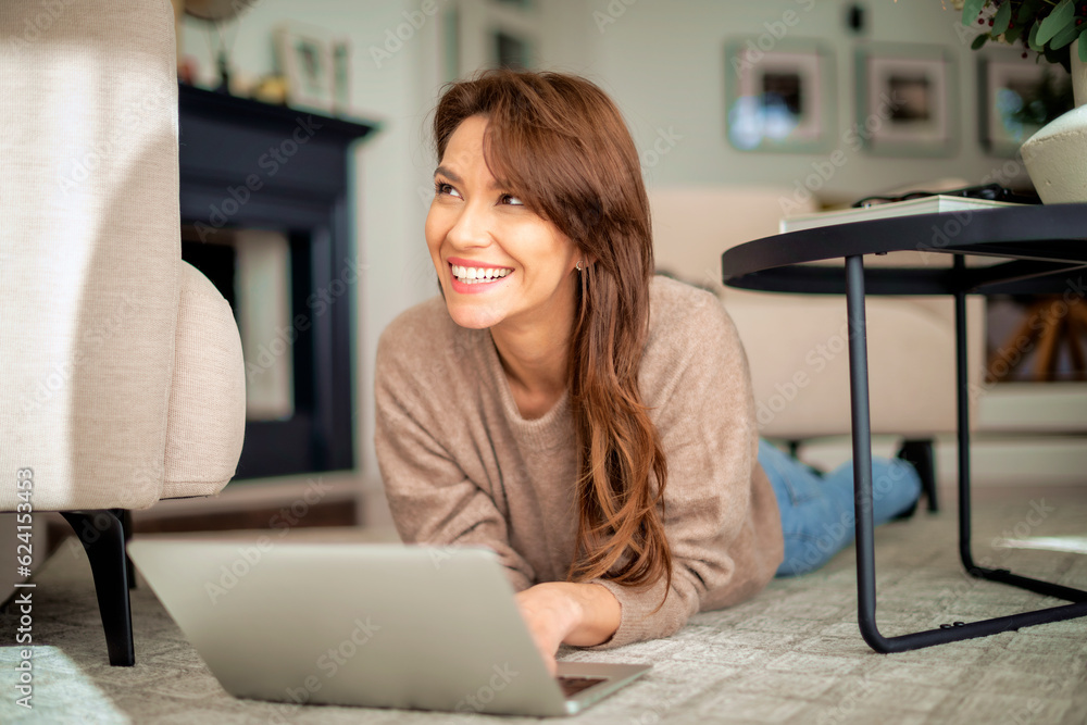 Attractive mid aged woman lying on the floor in a modern home and using laptop for work