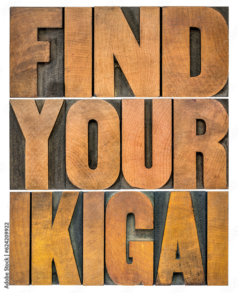 find your ikigai - isolated word abstract in letterpress wood type - Japanese concept of a reason for being and life purpose