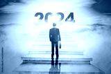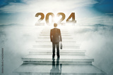 Rear view of businessman carrying a briefcase while walking on the stairway toward 2024 new year numbers