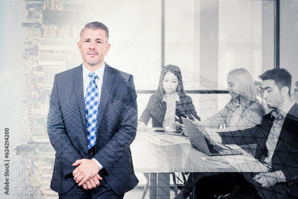 caucasian business manager with business team using laptop while discussing together with modern city background