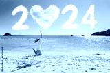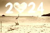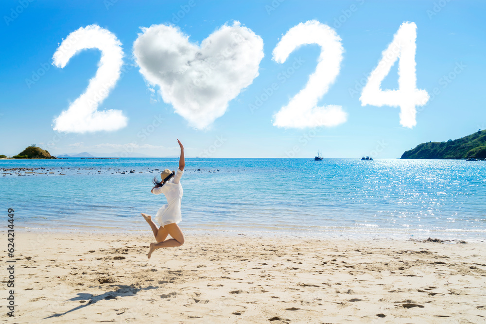 Side view of a woman jumping on the beach with clouds shaped heart and 2024 new year numbers