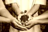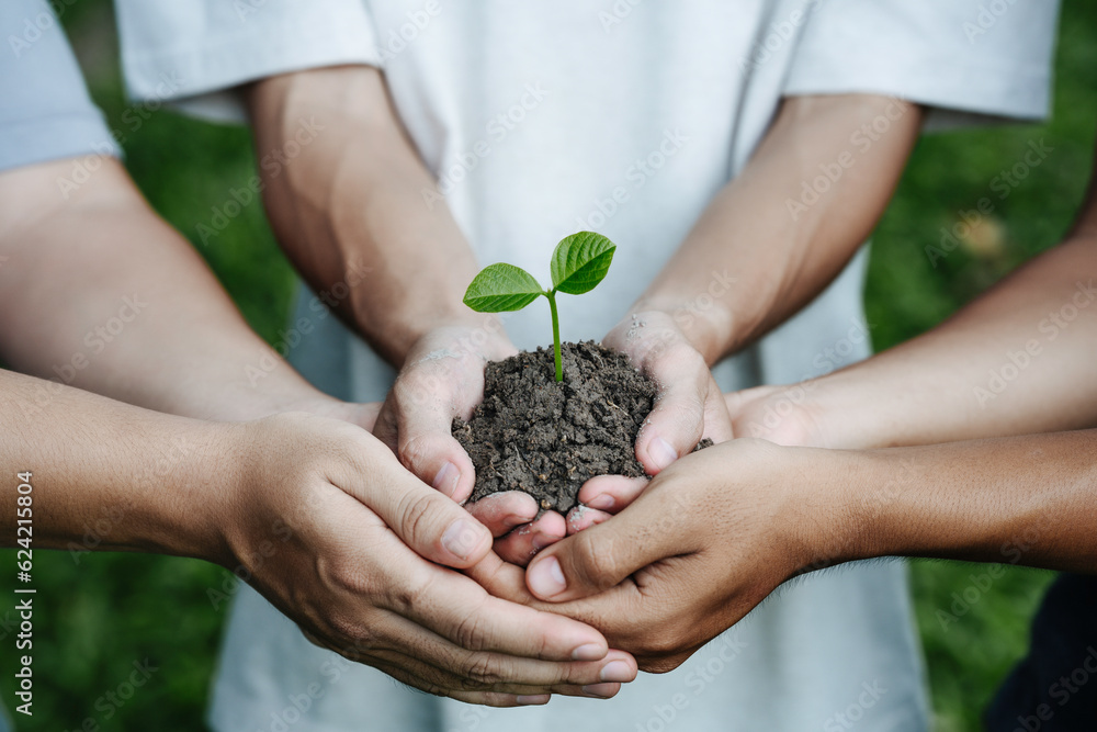 A group of volunteers holds a small tree in their hands for Plant. Concept of world environment day. community service nature for a sustainable environment. Climate Change, global care.