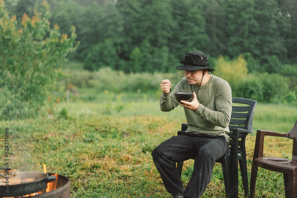 A man enjoy the food by the fire. Hiking camp with a bonfire in the forest. Tourist on recreation outside. Campsite lifestyle
