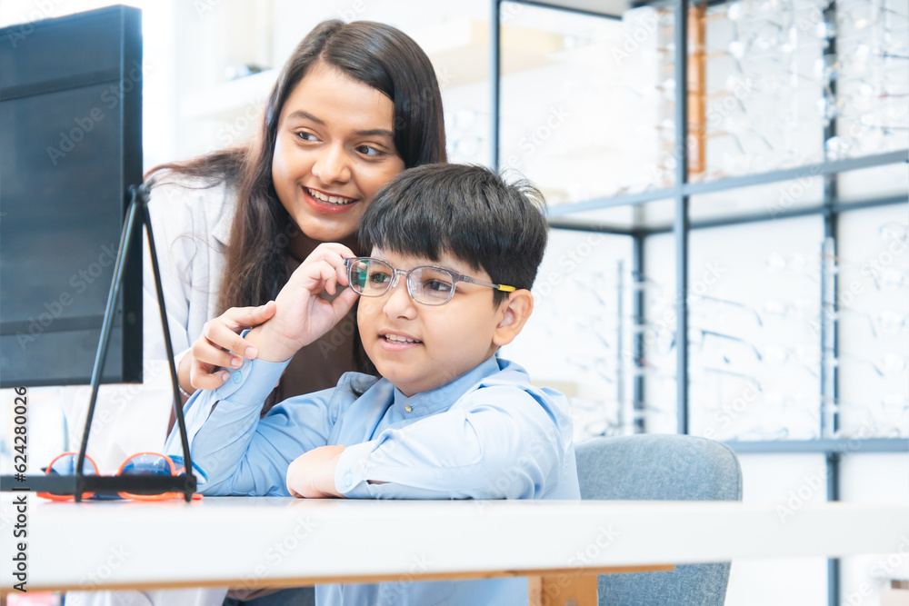 Indian cute child boy trying and choosing new eyeglasses with young optometrist woman or doctor at ophthalmology clinic or optics store, smiling, looking in the mirror, love a glasses frame he wearing