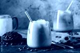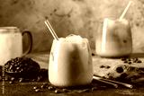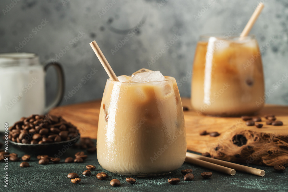 Ice coffee in a tall glass with cream poured over, ice cubes and beans on a dark concrete table.