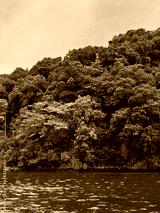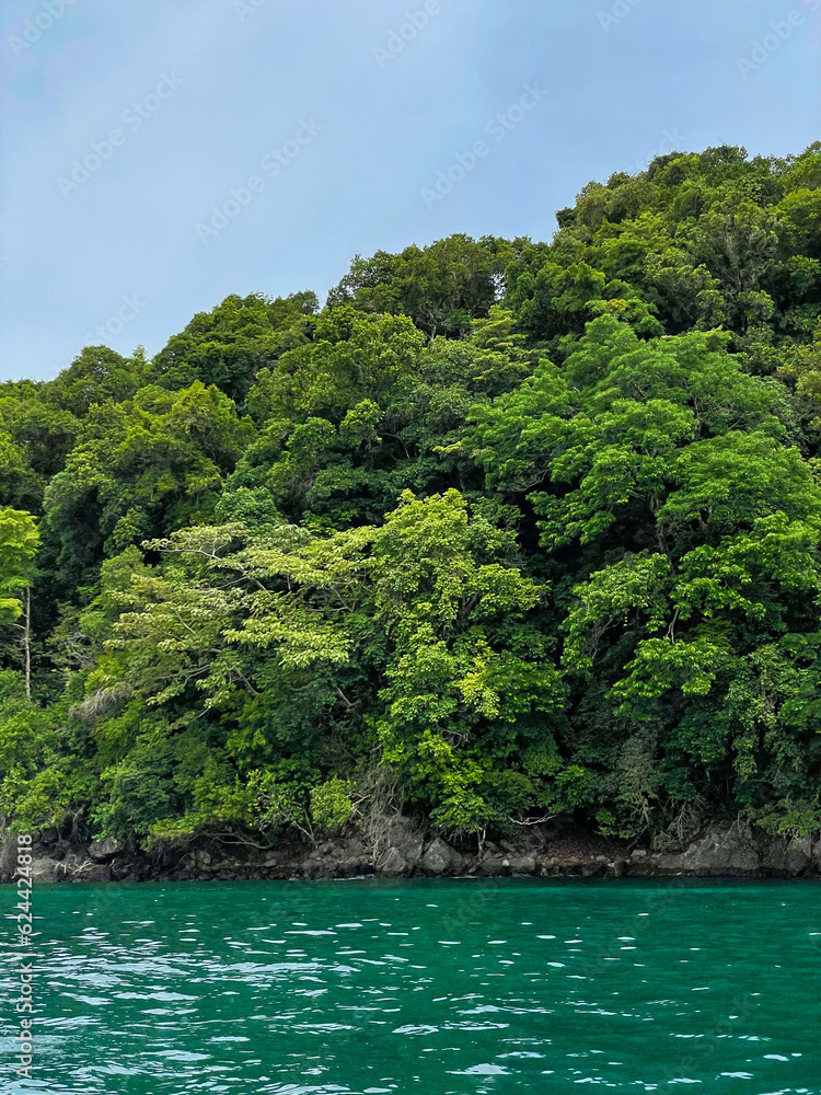 Inaccessible tropical island overgrown with lush green tropical vegetation