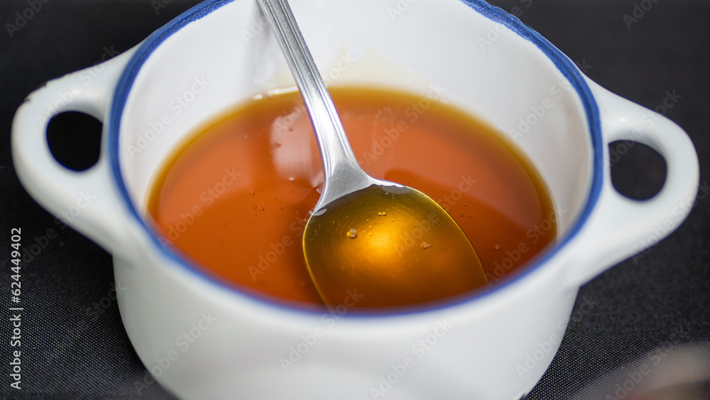 Smooth golden honey with a spoon inside the white bowl