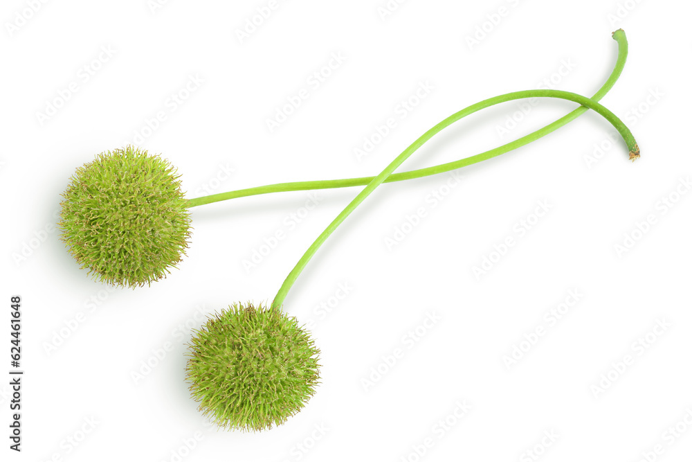 fruit of sycamore plane tree isolated on white bacground. Top view. Flat lay