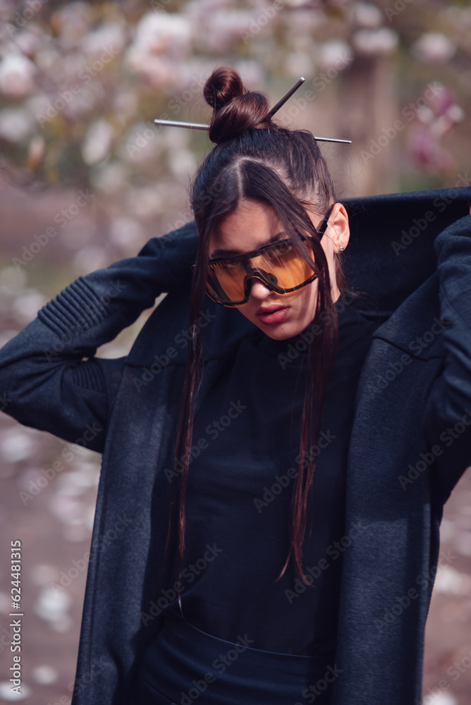 Beautiful young woman wearing kimono and yellow glasses with cherry blossoms, sakura view