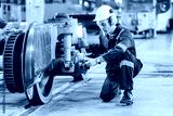 Engineers inspecting locomotive in railway engineering facility