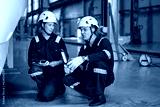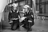 Engineers inspecting locomotive in railway engineering facility