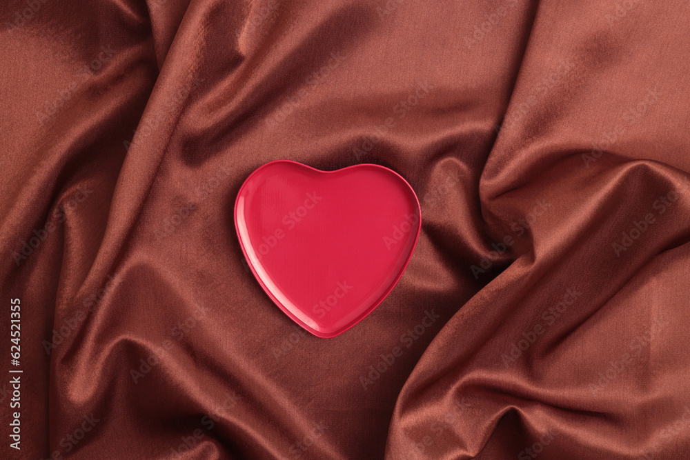 Empty red Heart frame podiun. Abstract brown pearl wave silk fabric texture background.