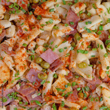 Nudelpfanne, Schinkennudeln in einer Nahaufnahme