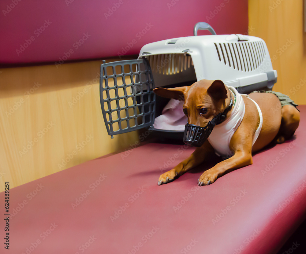 A dog in a muzzle is lying on a shelf on the train.