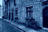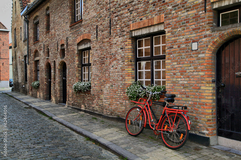 Red bicycle near the window of brick house in Brugge, Belgium.