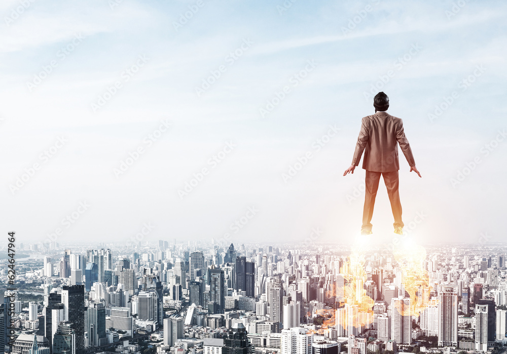 Businessman in suit and aviator hat flying in sky