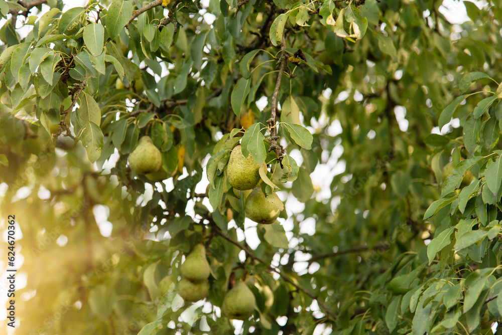 Close up of branch with ripe pear in garden. One ripe pear on tree in orchard with sunny light