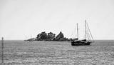 Touristic boat in Adriatic sea in Montenegro close to island in sunny day. Beautiful Mediterranean nature