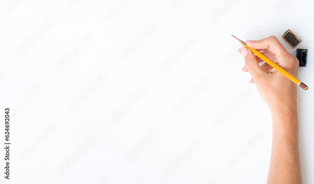 Top view of girl's hands drawing with pencils and paints with copyspace