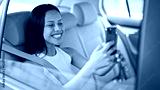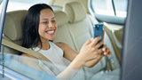 Young beautiful hispanic woman passenger make selfie by smartphone sitting on car at street