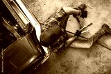 Tired Classic Cars Mechanic Resting on a Garage Floor