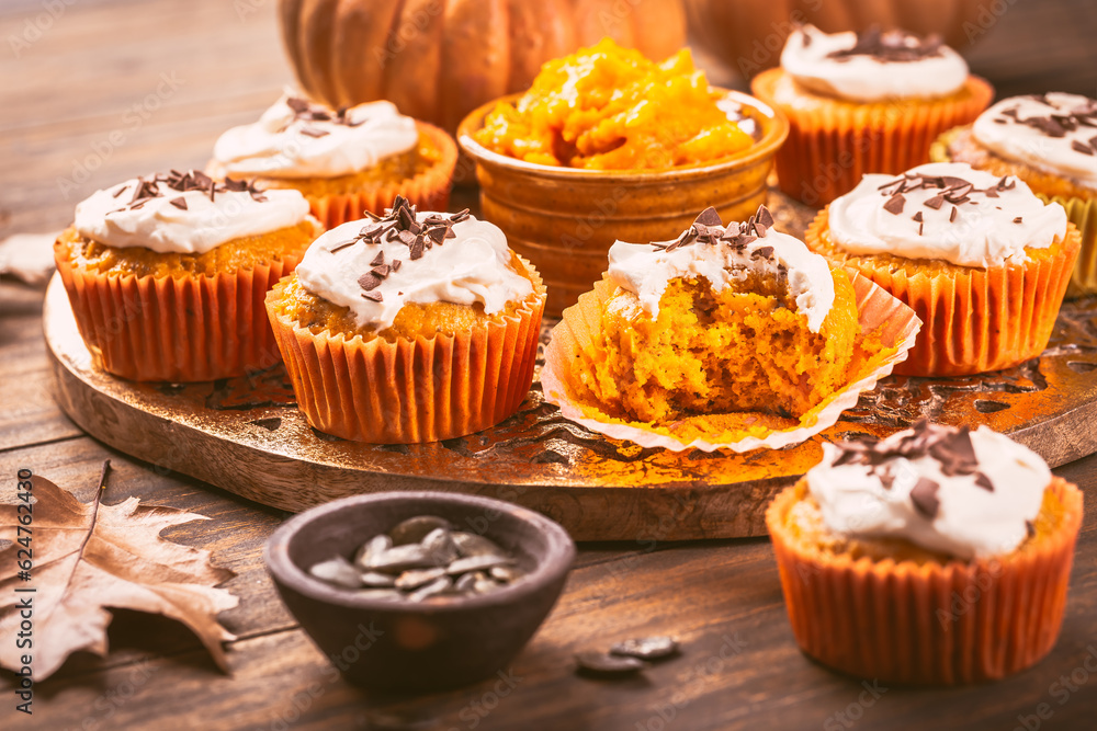 Spicy pumpkin muffins or cupcakes with cream cheese frosting
