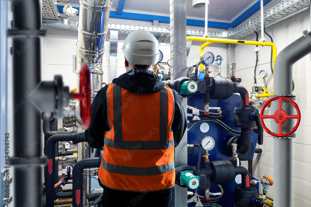 Engineer with back to camera. Man near boiler equipment. Worker in helmet stands in basement. Engineer inspects industrial equipment. Boiler room with pipes. Boiler system installation concept