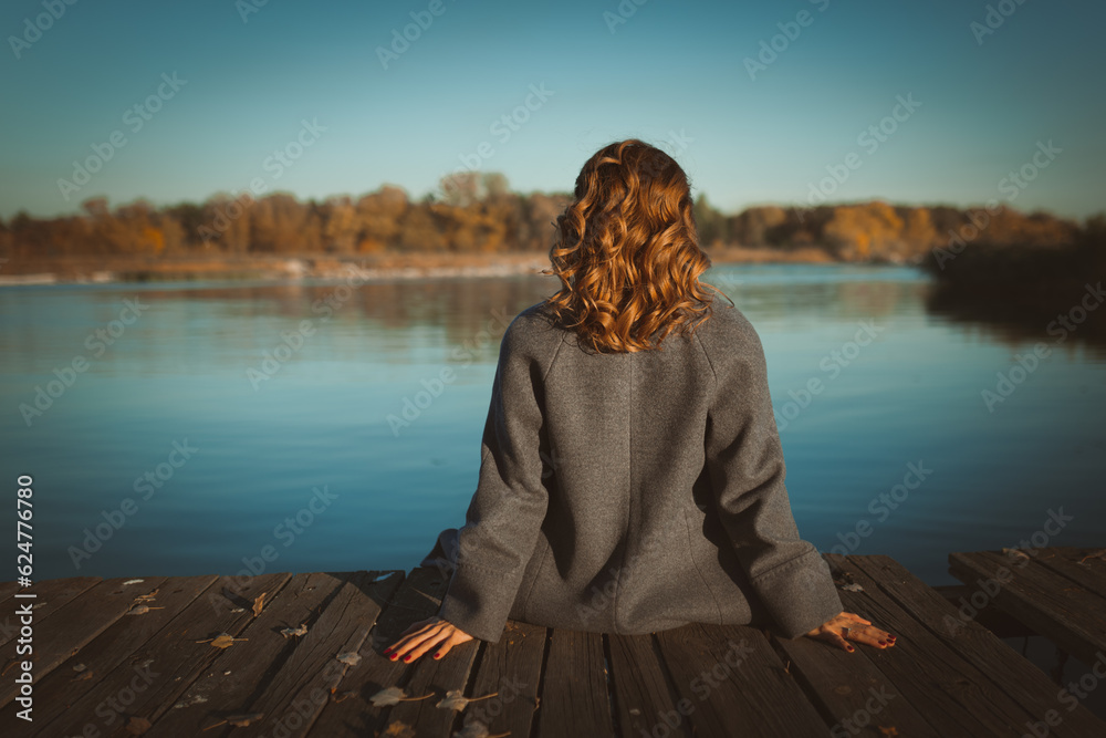 A girl in a coat sits on a wooden bridge in autumn, rear view