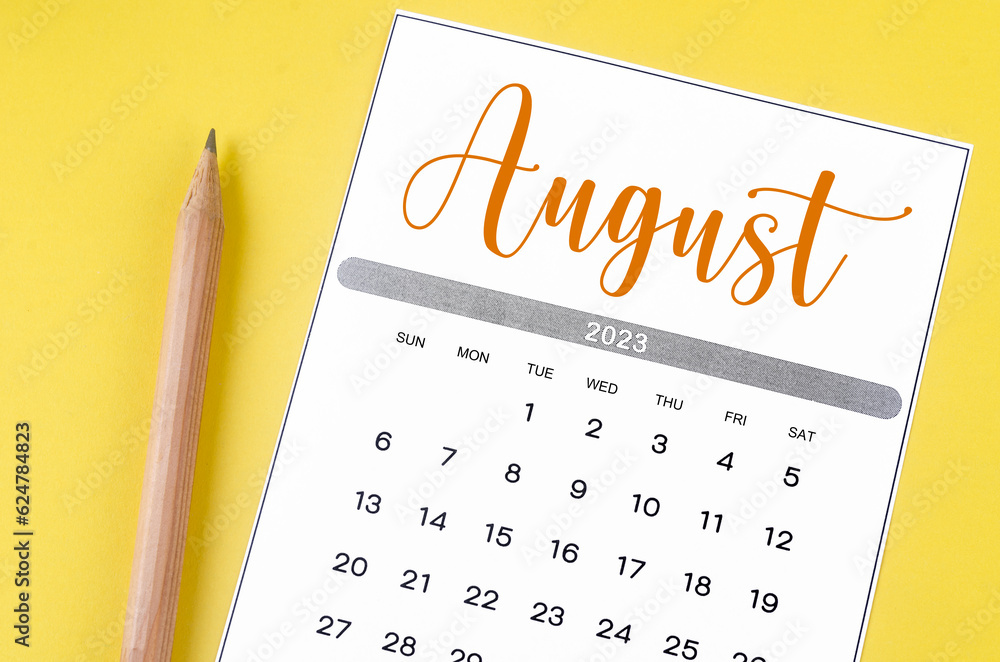 The August 2023 Monthly calendar for 2023 year with pencil on yellow background.
