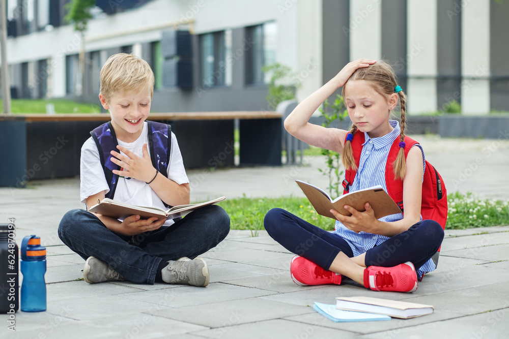 Two children read books together and talk in school yard. Back to school. Mental health.