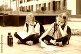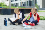 Schoolchildren are bored reading books and studying homework in school yard. Mental health.