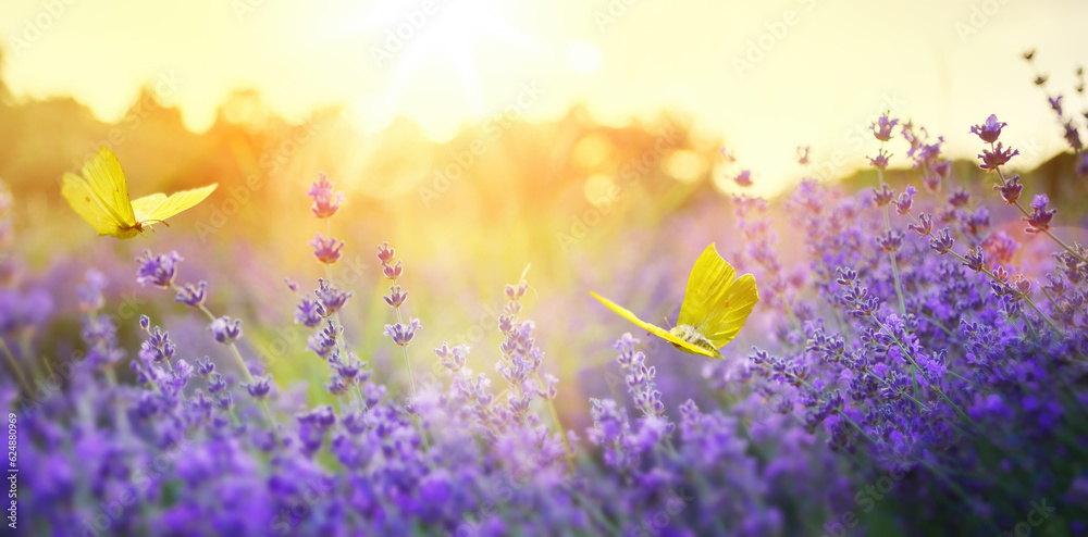 summer forest glade with flowering lavender flower and butterflies on a sunny day; back lighting, high key