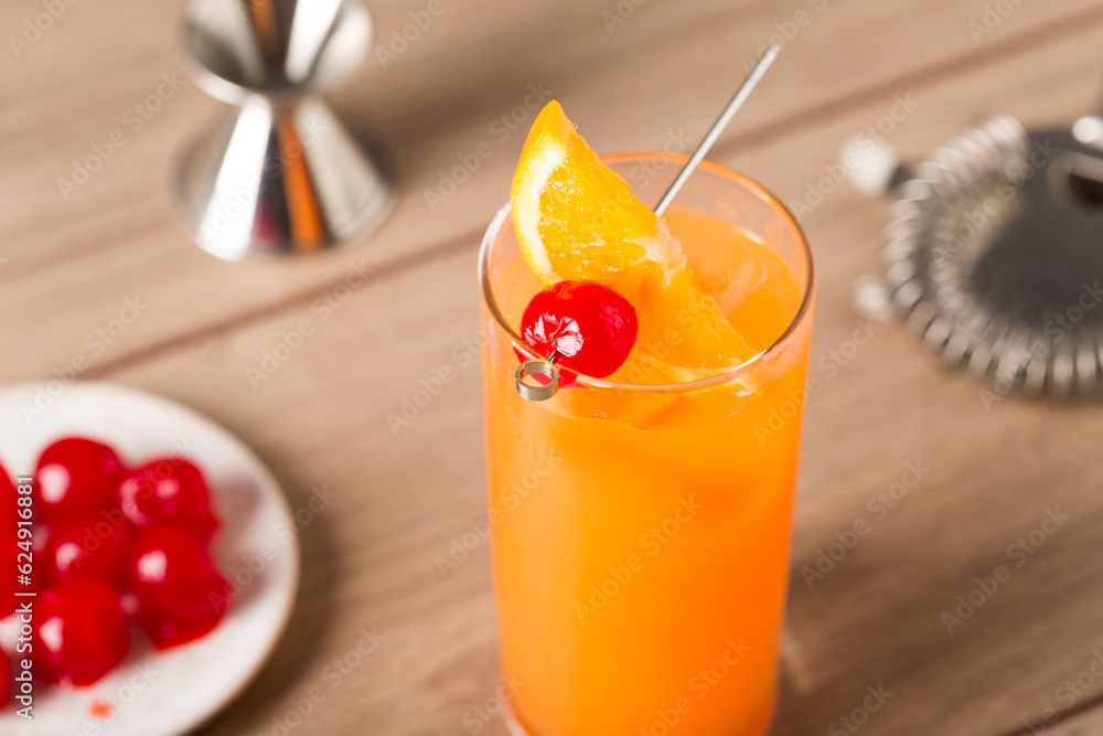 Homemade Tequila Sunrise Cocktail refreshment tequila, fresh orange juice, fresh lime juice and grenadine garnish with an orange slice and a cherry