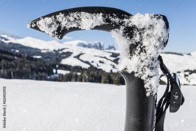 Close-up of mountain stick with snow, enclosing Sciliar mount in the Dolomites