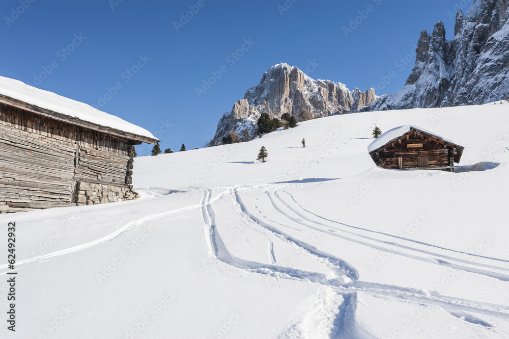Ski marks in the snow, between Mountain huts, against Dolomites and Blue Sky