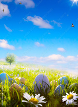 art easter eggs on spring field